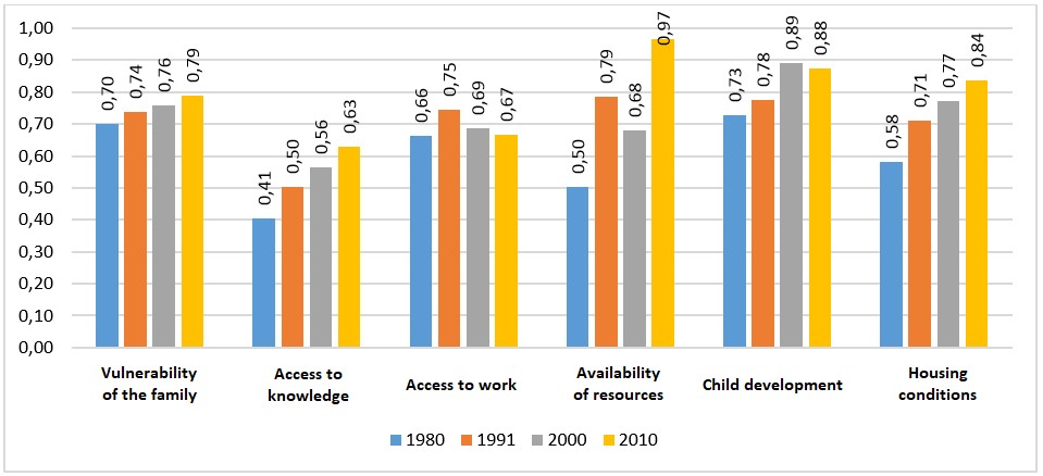 This study analyzed the situation of families in the city of Viçosa in 1980, 1991, 2000 and 2010 from a multi-dimensional perspective based on methodology adapted from that of Barros, Carvalho and Franco (2003), which was based on micro-data from the demographic census. Through the enormous amount of information contained in the database, it was possible to undertake a broad analysis enabling the household’s living conditions to be evaluated.