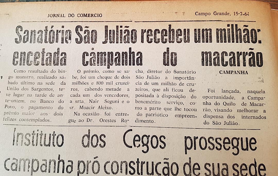 SANATÓRIO São Julião recebeu um milhão: encetada campanha do macarrão. Jornal do Comércio, Campo Grande, 1964.